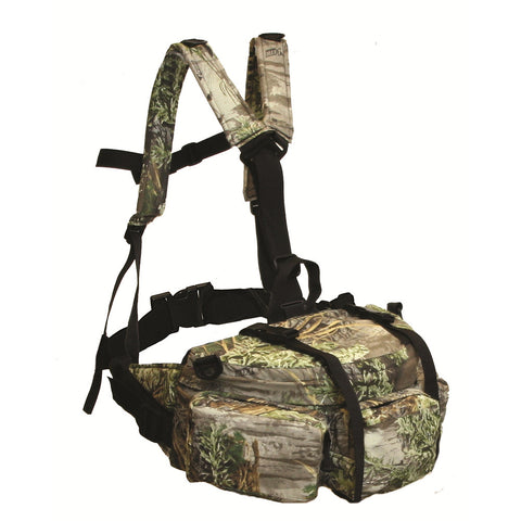Our #1 selling pack The Coyote, is the Big brother to our Ridge Runner Fanny pack. This pack not only hauls your gear, it keeps it organized with 3 roomy external pockets measuring 6 x 4.5 x 2. Don't be afraid to load it up; it can handle it! The roomy main compartment measures 16 x 8.5 x 6. Thanks to the fully padded hip & shoulder straps you won't spend your afternoons wishing you had packed lighter. This pack is perfect for 1/2 day hunts, sitting Whitetail and Bear stands, and all around day hunt. Can be quickly connected to our Peak1 Frame if desired for sitting waterholes for Elk, etc where you may want a frame to pack out meat on the spot. Shoulder straps are removable for this if desired. Cargo straps allow you to add our Stuff sack for coats, sleeping bags, or other bulky gear to keep it out of your way when not needed.